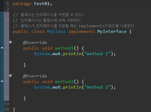 클래스에서 인터페이스를 구현할 때 그 인터페이스가 갖고있는 메소드를 오버라이드해야함