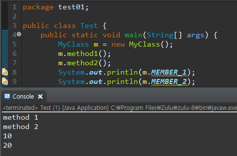 MyIterface 에서 저 MEMBER_1 같은 int들을 정의할 때 static으로 했었어서 저 타입의 이름으로 바로 접근가능함