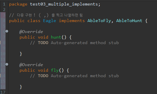 >>>>>>> extends 가 아님, implement 여러개 가능(다중구현)