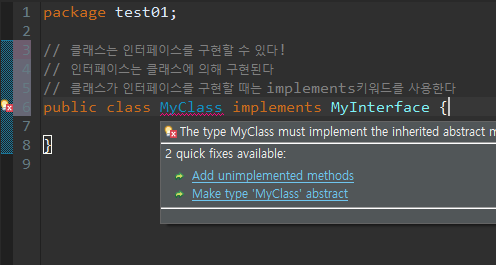 클래스에서는 implements 키워드를 이용해서 인터페이스를 구현할 수 있음